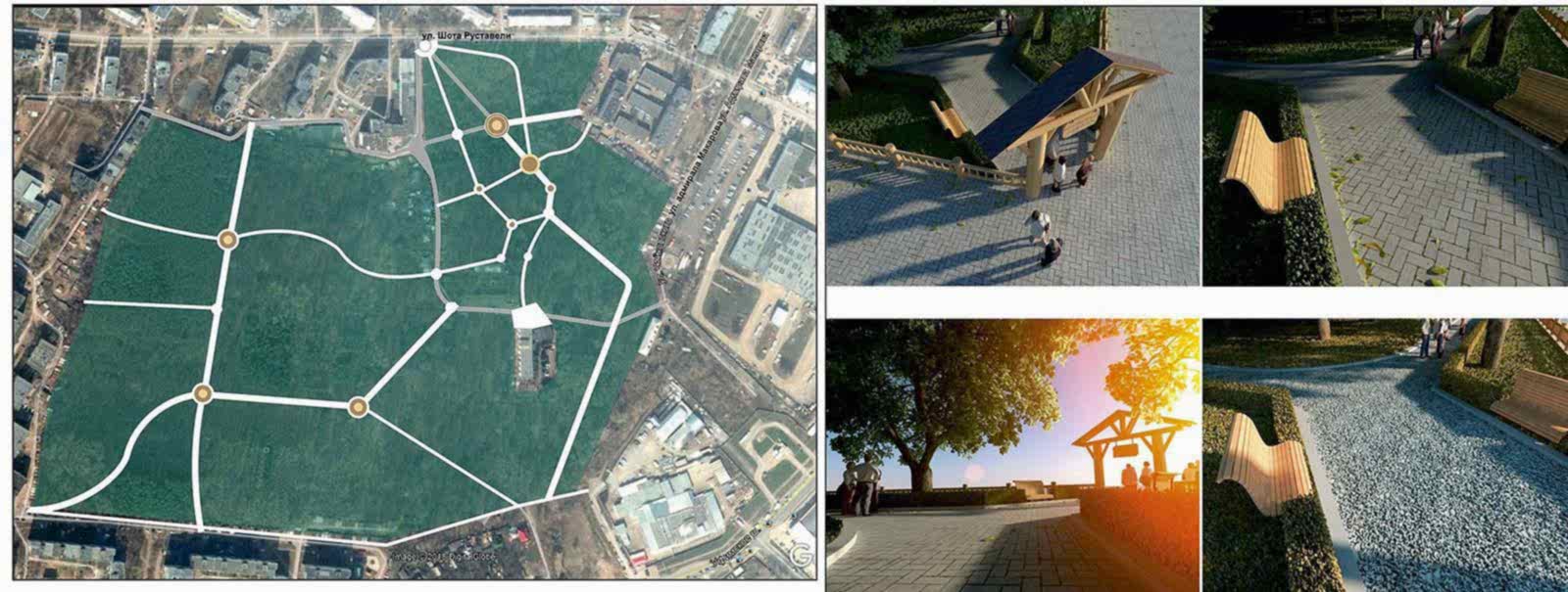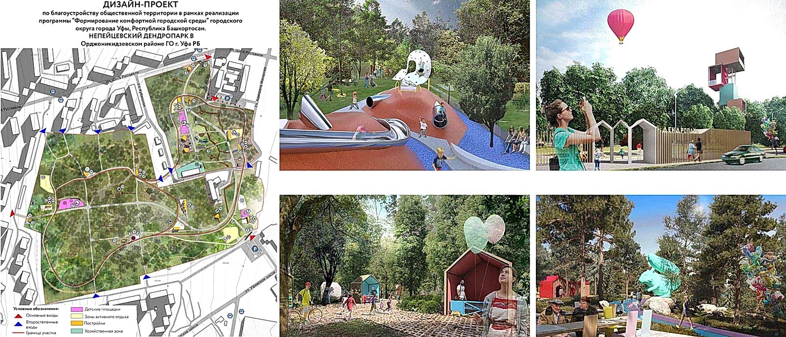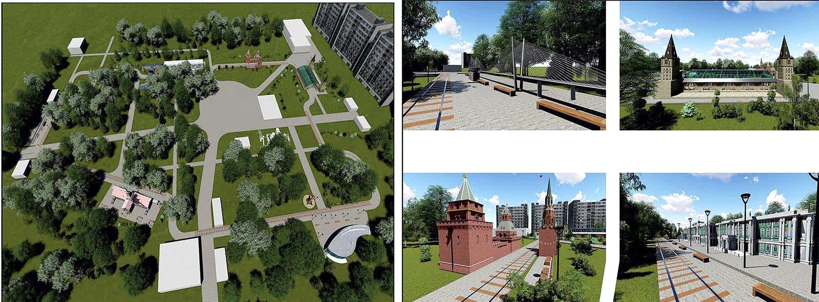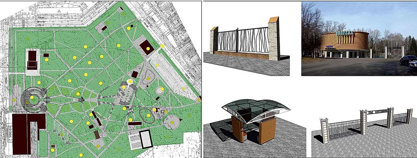 В парке планируется уложить тротуарную брусчатку, обновить тротуарное и асфальтовое покрытие, освещение, парковые скамейки, урны. Провести реконструкцию входных групп. Организовать территорию для тихого отдыха с беседками, построить фонтан, установить детские и спортивные Pin-Up Дизайн-проектом предусмотрена организация вольера и площадки для выгула собак, а также парковки.
