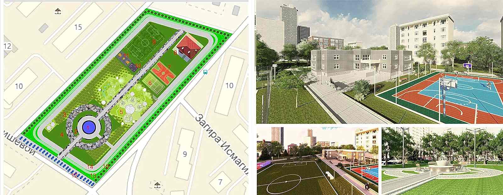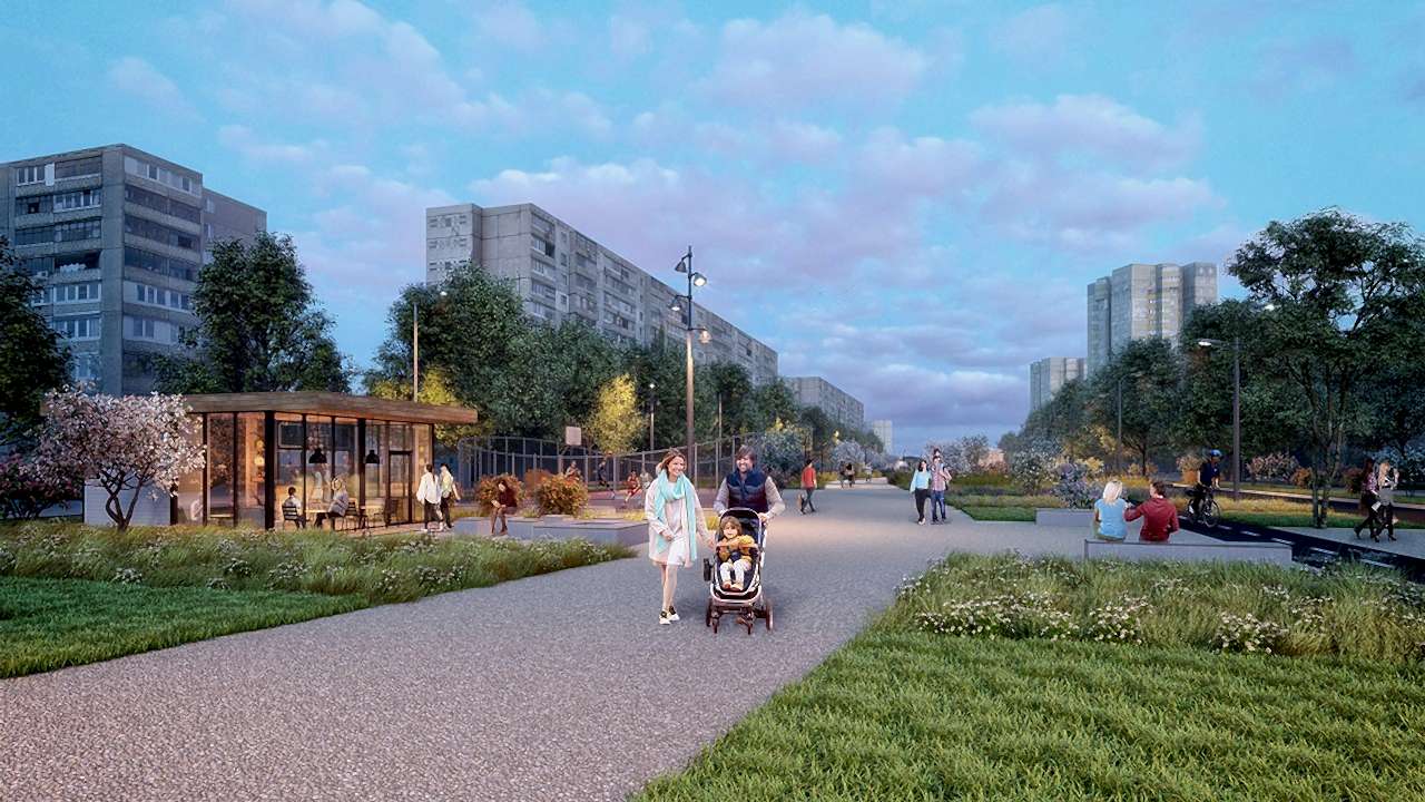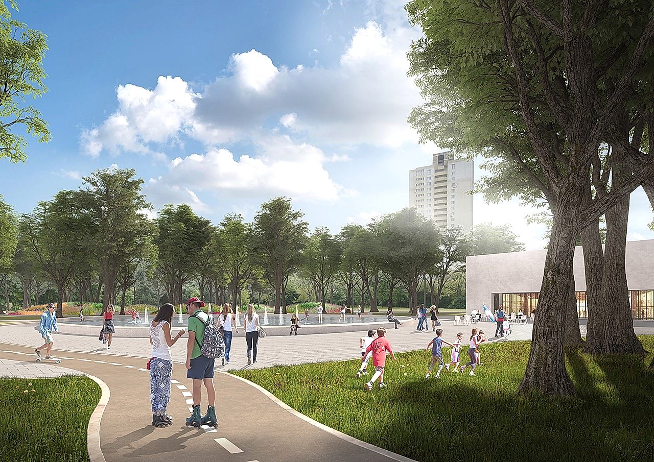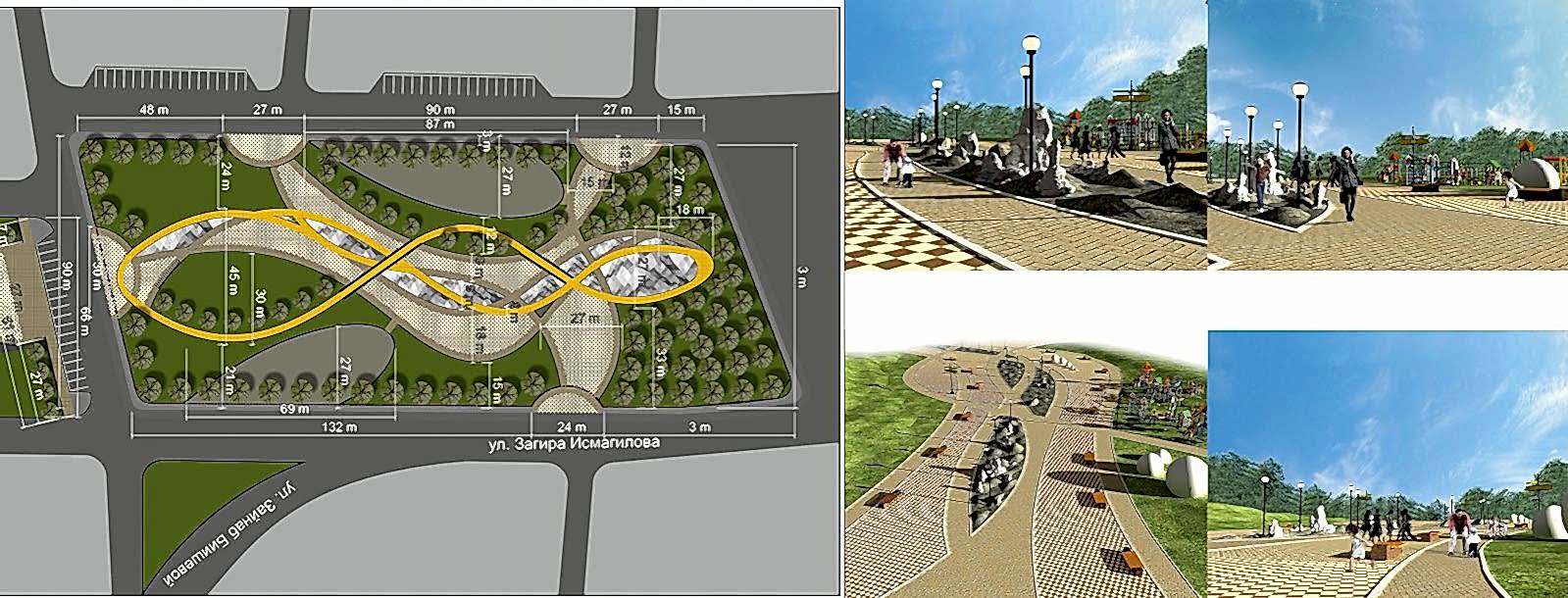 Помимо традиционного обустройства в сквере входной группы, Pin-Up парковых скамеек и урн, дизайн-проектом предусмотрены велосипедные дорожки, целый детский уличный городок, скейт- и веревочный парки, волейбольные площадки, футбольное поле и многое другое.