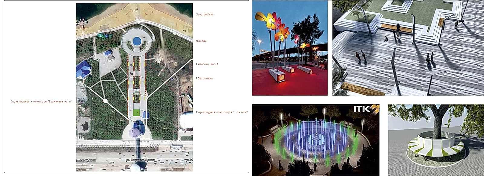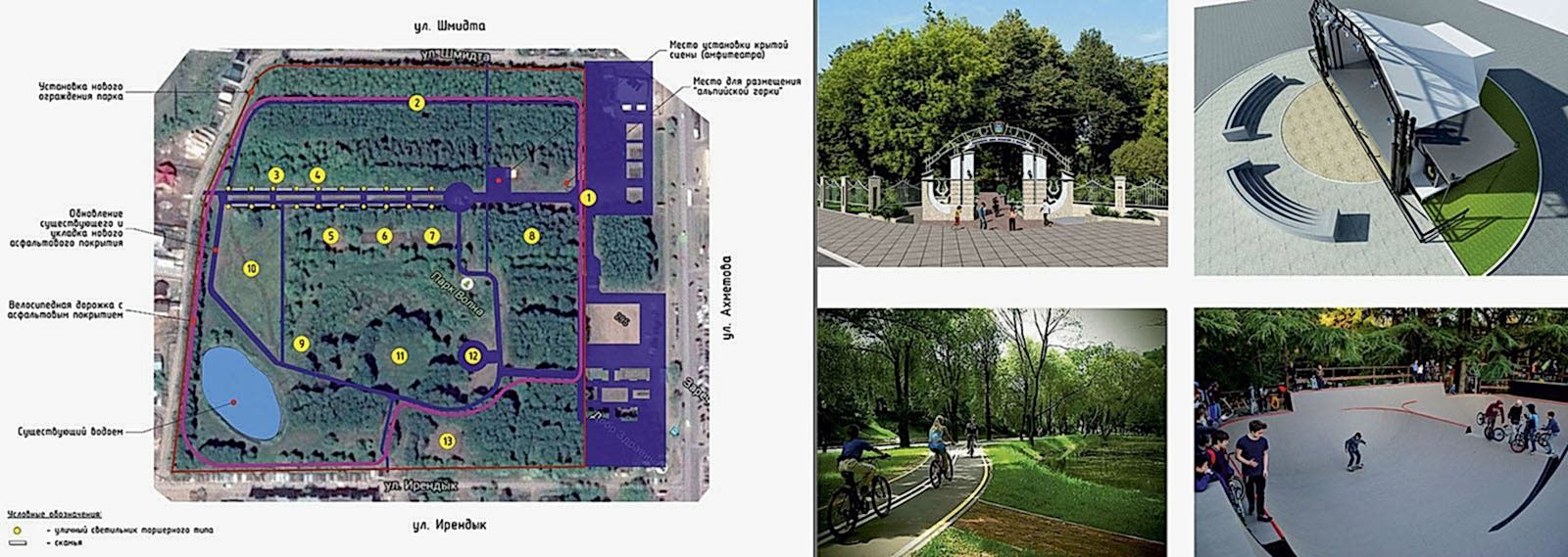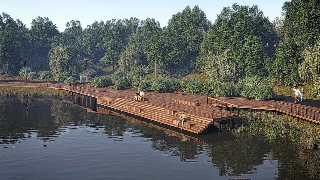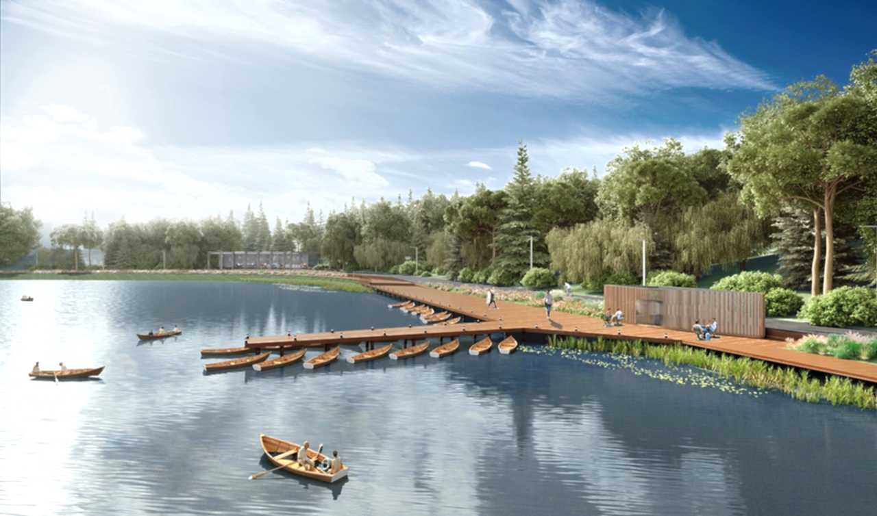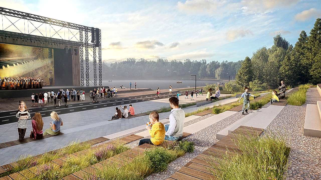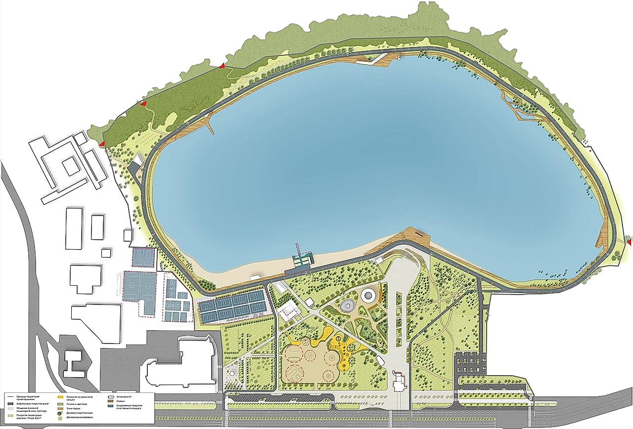 Дизайн-проектом предусмотрено Pin-Up амфитеатра с видом на воду, обновление спортивной зоны и парка аттракционов, создание детской игровой площадки, размещение скейт-парка, кафе и зон отдыха вокруг озера, мероприятия по озеленению и освещению территории, обновлению покрытий и обустройству новых пешеходных путей.