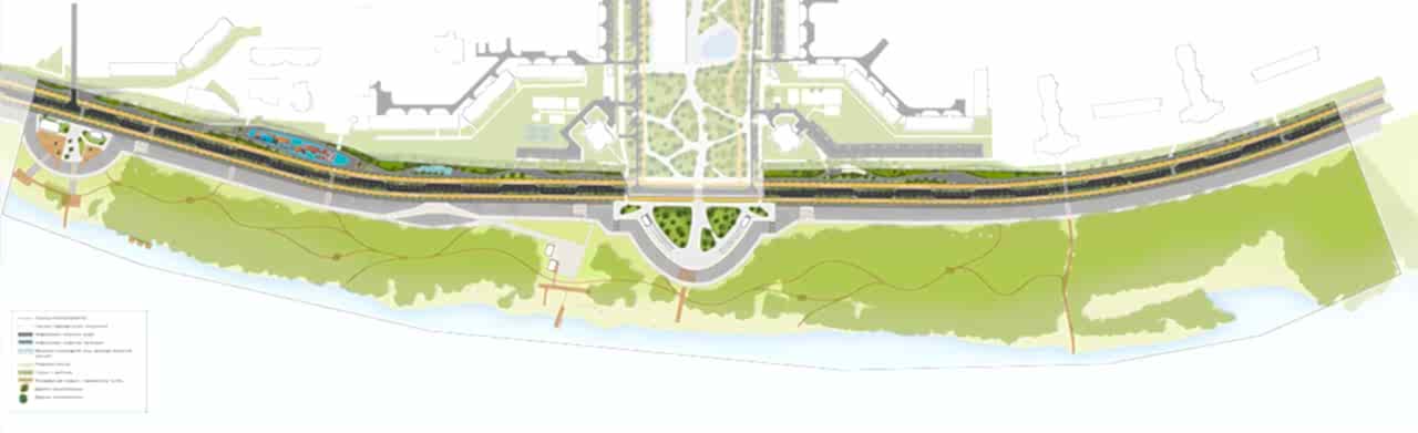 Проектом предусмотрено разделение велосипедных и пешеходных путей, создание отдельных беговых дорожек и дополнительных спусков к реке. На протяжении одног. о километра от, ул Толе би, 35.Бикбая до паромной переправы размещаются смотровые площадки с кафе и пунктами проката, а также зоны для тихого отдыха и занятия спортом. Также предложено благоустройство пляжа и безопасных мангальных зон.