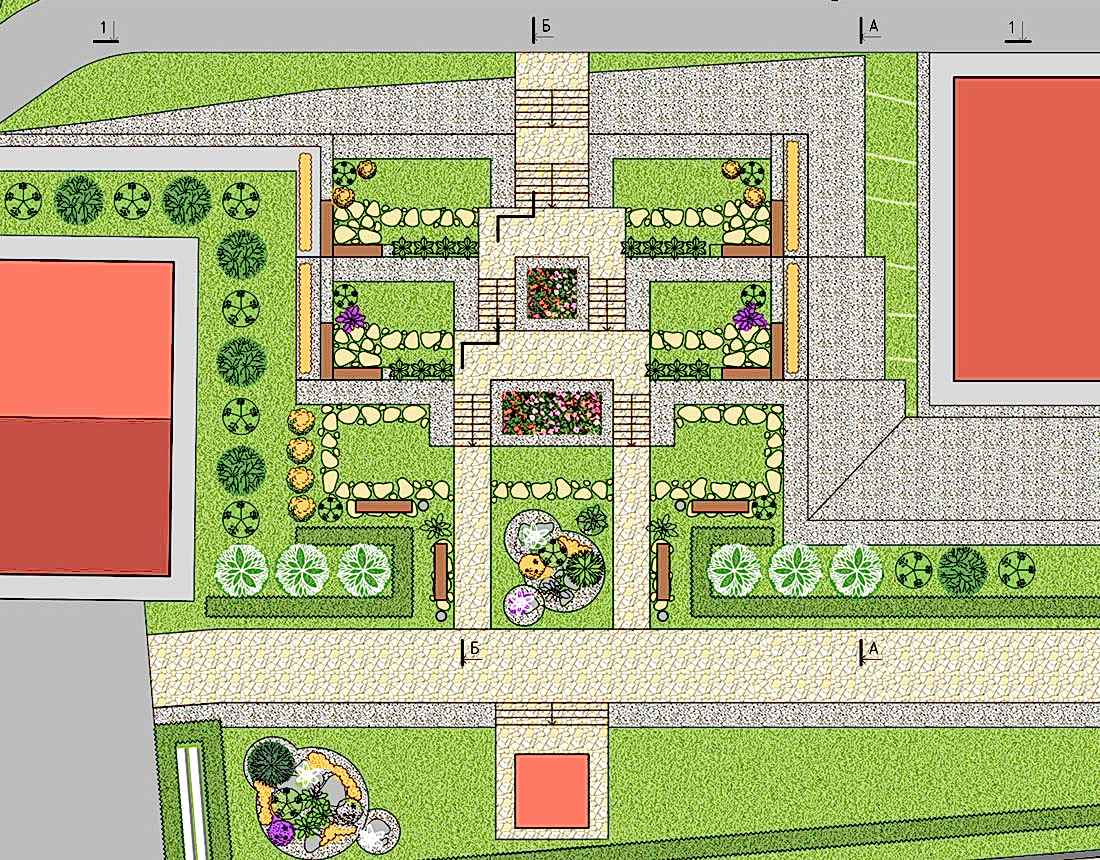 Разбивочным базисом может быть любая прямая линия, проходящая через две закрепленные на местности точки, которые обозначают прописными буквами русского алфавита. Выполняют размерную привязку координационных осей здания, сооружений к разбивочному базису. Вокруг контура здания, сооружения показывают отмостку и въездные пандусы, наружные лестницы и площадки у входов. На разбивочном плане в части автомобильных дорог наносят и Pin-Up ширину автомобильных дорог; радиусы кривых по кромке проезжей части автомобильных дорог в местах их взаимного пересечения и примыкания. - Проект (раздел) «Цветочное оформление»выполняется при проектировании любой территории благоустройства (парки, сады, скверы, бульвары, дворовые территории и т.д.). Отдельно проекты цветочного оформления выполняются для благоустроенных территорий, в тех местах, где необходимо разнообразить однородный ландшафт, придать территории какие-то определенные цветовые и тематические акценты, или просто украсить территорию.